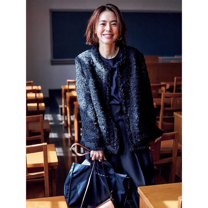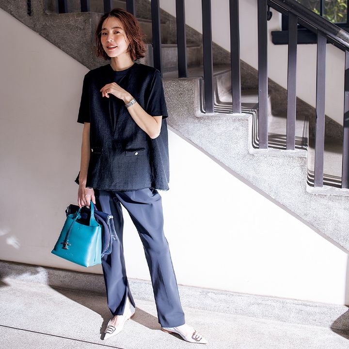 フランスのファブリックメーカー、“Clarenson社”の生地を使用、立体感のあるツイードジャケットは、まさにきちんと感と華やかさを兼ね備えた1枚。いつもならオールネイビー、のところをジャケットとパンツで黒を投入したら、ワントーンより一歩奥行きのある着こなしが実現! ツイードジャケット¥99,000(サードマガジン)Tシャツ¥12,100(エブール/エブール GINZA SIX店)パンツ¥28,600(プルミエ アロンディスモン)バッグ¥81,400(デメリエール/トゥモローランド)ピアス¥22,000 ※4月25日発売(ジュエッテ)リング¥41,800(リューク)