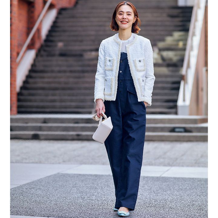 イタリア製の上質な生地にビジューボタンがきらめく、ラグジュアリーなツイードジャケット。正統派のかっちりジャケットに、あえてラフなオールインワンを合わせると新鮮!オケージョン感なし、今年らしい“きれいめカジュアル”を楽しめます。 ツイードジャケット¥174,900(MW)リブニット¥35,200(デパリエ/デパリエ伊勢丹新宿店)オーバーオール¥49,500(ギャルリー・ヴィー/ギャルリー・ヴィー 丸の内店)バッグ¥148,500(ザンケッティ/八木通商)パンプス¥75,900(ペリーコ/エブール GINZA SIX店)