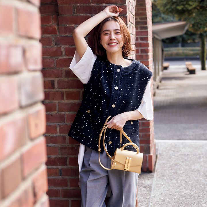 お花のキラキラがちりばめられたツイードジレはレフ板効果も発揮!白Tに重ねるだけで華やかなムードを纏えます。金ボタンにフリンジ、スパンコール…、と大人の甘さがぎゅっと詰まったネイビーは、着るたびに高揚感! ツイードジャケット¥72,600(エブール/エブール GINZA SIX店)ブラウス¥19,800(ル フィル/ル フィル ニュウマン 新宿店)パンツ¥44,000(ハイク/ボウルズ)バッグ¥70,400(デメリエー/ルル ウィルビー/アルアバイル)