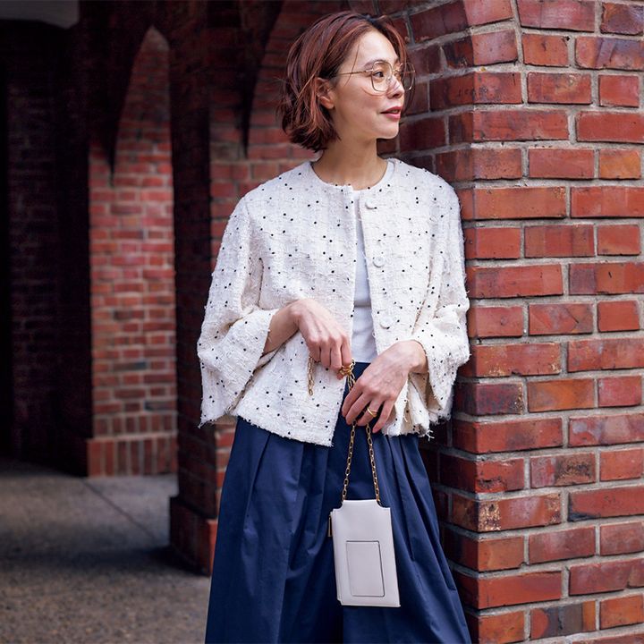 ボックスシルエット&ベルスリーブの優雅な作りがネイビーパンツに映える!セレモニーとは一線を画すデザインで、オシャレして行きたい食事会にもぴったり。 ツイードジャケット¥110,000(デパリエ/デパリエ 伊勢丹新宿店)タンクトップ¥7,700(ネイブ/オンワード樫山)パンツ¥35,200(エッフェ ビームス/ビームスハウス 丸の内)バッグ¥24,200(オルセット/オルサ)眼鏡¥34,980(バーバリー/ルックスオティカジャパン カスタマーサービス)リング¥26,400(リューク)