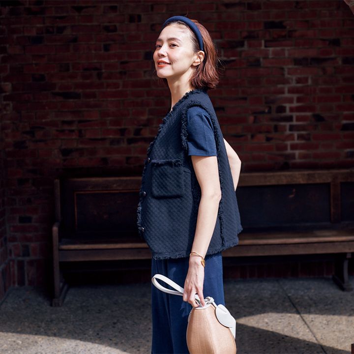 ジャケットより気楽に着られるリネン混の軽やかジレ。Tシャツのラフさもさりげなく払拭、頼れる新星アイテムです。 ツイードブラウス¥39,600(エブール/エブール GINZA SIX店)Tシャツ¥15,400(エイトン/デミルクス ビームス 新宿)パンツ¥27,500(スタンニングルアー/スタニングルアー青山店)バッグ¥185,900(トッズ フォー ロンハーマン/ロンハーマン)シューズ¥86,900(ペリーコ/トゥモローランド)ピアス¥24,200(エテ)リング¥8,800(ジュエッテ)時計¥289,300(ロンジン)
