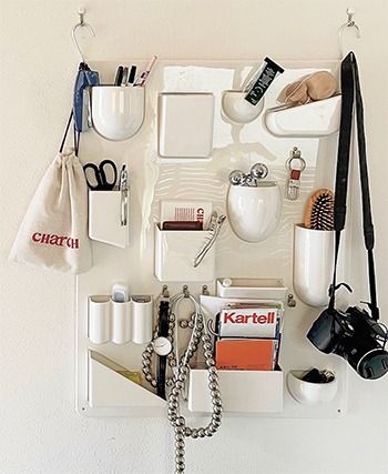 「見せる収納」であっても、美しさをそこなわずに完結させるのがマイルール。いちばんのお気に入りは、複数のポケットやフックがそなわった壁かけ収納「Vitra」utensilo2。文房具や小顔ローラ、腕時計などを収納しています。フォルムにアート性があり、どんなものを入れてもデザインっぽくオシャレに演出してくれるので細々したものをまとめています。(anyumaさん・主婦)
