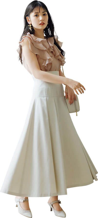 サイドリボンミュール(H6cm)¥19,250/ダイアナ(ダイアナ 銀座本店) フリルブラウス¥9,900、チェーンバッグ¥13,200/ともにNoëla フレアスカート¥11,440/PROPORTION BODY DRESSING フラワーイヤリング¥6,820/フェリーチェ(ロードス)