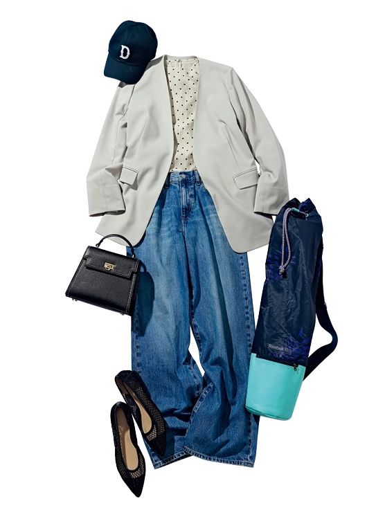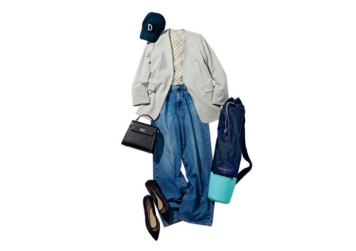 セットアップ(ジャケット)¥14,990/アンフィーロ(オンワード樫山) デニムパンツ¥3,990/UNIQLO ドットブラウス¥12,100/ミラ オーウェン ルミネ新宿2店 スクエアバッグ¥13,750/ノエラ チュールパンプス¥2,290/GU キャップ¥4,499/デッサン(ワールド)
