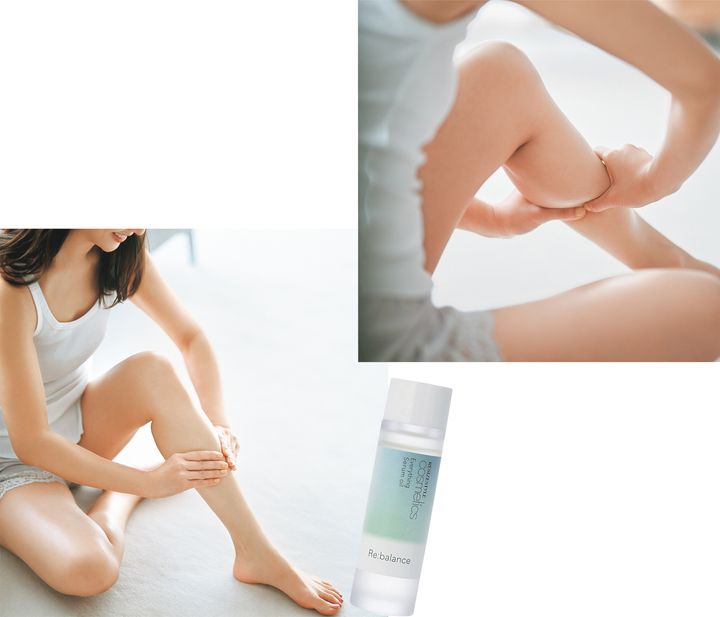 セラムオイルを塗布したら、ふくらはぎを笛を吹くような感じで掴み、親指でグッと押しながら足首に向かってマッサージ。エブリシングセラムオイル ¥2,900(リサイズスタイルコスメティクス)