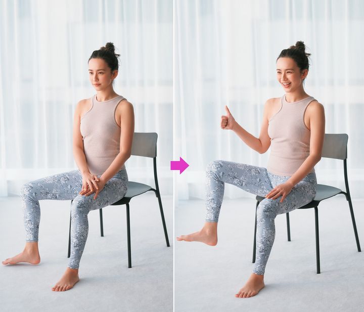 座骨だけつけて椅子に浅く座り、足裏を床につけ背筋を真っ直ぐ伸ばす。体は前を向いたまま足をボール1つ分くらい空くように、真横に開く。開いた状態で足のアップダウンを10回繰り返す。