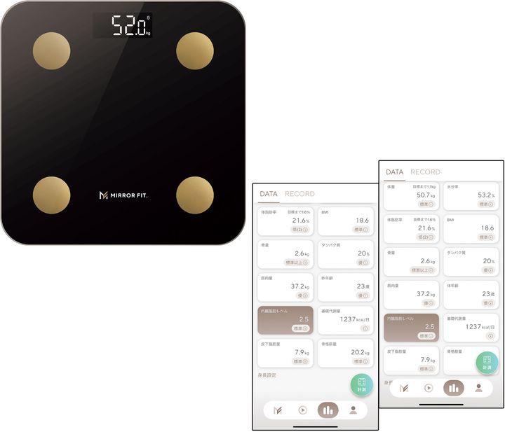 体は体重ではなくバランス重視。携帯と連動し計測したデータがいつでも見られて便利。MIRROR FIT.スマート体組成計 ¥9,878(ミラーフィット)