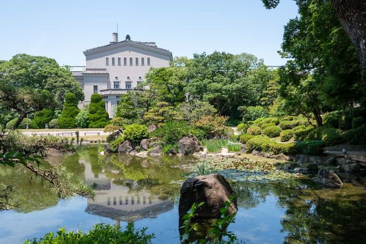 庭の中央にはルネサンス様式の大盃型噴水があるほか、築山林泉回遊式の日本庭園も広がっています。筆者は、この建物を初めて目にしたとき、一瞬、時が止まったかと思いました。それだけ見事な建造物なのです。