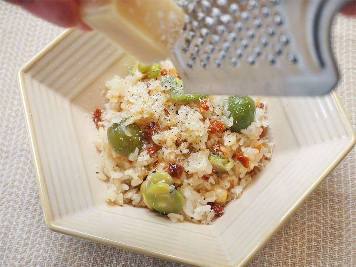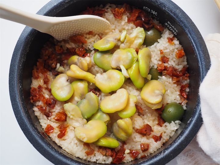 今回は、今が旬の「そら豆」レシピにチャレンジ!イタリアンレストランのオーナーでソムリエの“青池隆明さん“が提案するのは、そら豆を使ったイタリアンな炊き込みご飯。ドライトマトやグリーンオリーブを使うのも珍しいのですが、なんといっても気になるポイントは“さや“も一緒に炊き込むってこと。簡単だけどユニークかつ絶品の炊き込みご飯は、思わず誰かに披露したくなってしまうはず♡