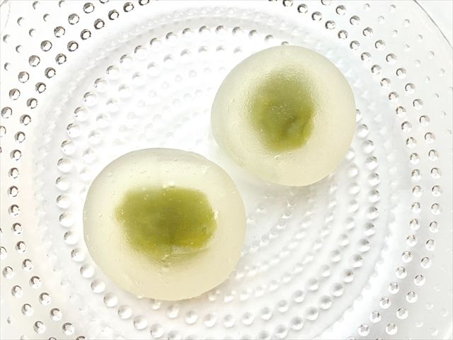 透明なわらび餅の中に、深緑色の餡が入っています。実はこの餡、マスカルポーネチーズとカマンベールチーズをブレンドしているんです! 濃厚な宇治抹茶にチーズが加わることで、まろやかになり、コクがでています。そして舌ざわりはとても滑らか。