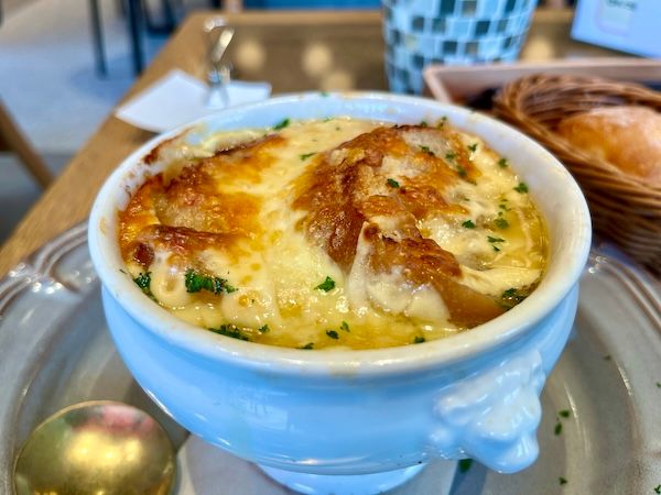 スープというよりメインでしょうというボリュームの食べ応えたっぷりのオニオングラタンスープ