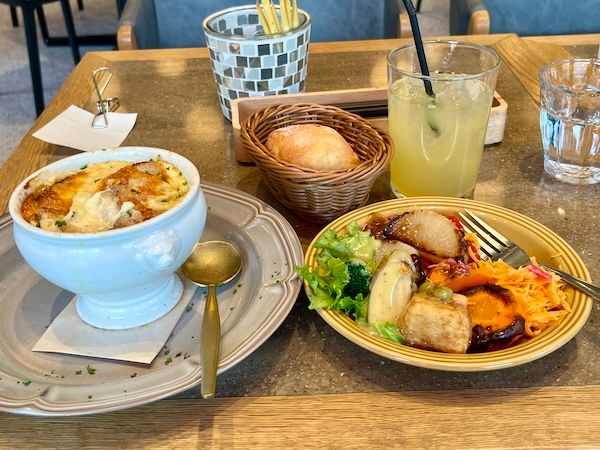 野菜ブッフェを堪能している間に到着したスープは、想像の2倍を軽く凌駕する主役級のボリュームでした。玉ねぎが丸々1個ぶん入っているのだとか。バゲットも入りチーズもたっぷり。メインと同額のプラス料金に納得。野菜たっぷりのランチは心も大満足。ちょっと食べ過ぎたかも…。
