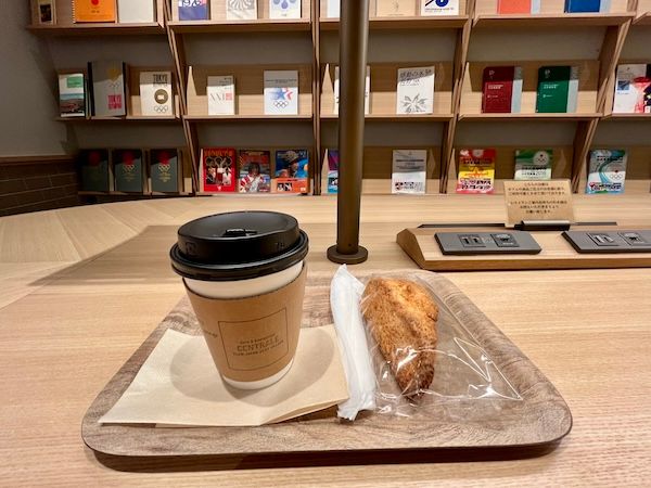 オリンピック関連の資料やサイン入りのグローブやバトンなど、大会を思い起こさせる記念グッズなどに囲まれた展示エリアとカフェエリアは天井も高めで心地いい空間。 大きなテーブルには電源もあり、作業カフェとしても立ち寄れそうです。再訪時にはゆったり気分でコーヒーとスコーンをいただきました。