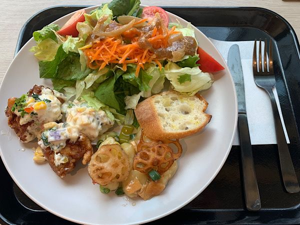 私のBセットがこちら(2種のデリとサラダ3種のトッピングにパンをつけました)。