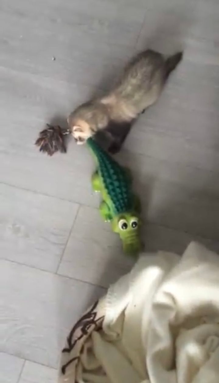 優位に立ったのは、フェレットのロムシーでした。 デボラをオモチャから遠ざけることに成功したこの子は・・・
