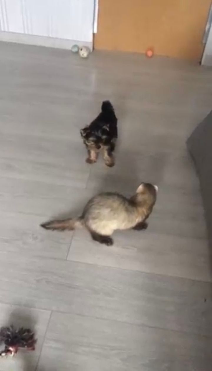 ヨークシャーテリアの子犬『デボラ』とフェレットの『ロムシー』が、ワニのオモチャを巡ってケンカしていました。 お互いに譲る気はないようで、「これは自分の!」と主張しているみたいです。