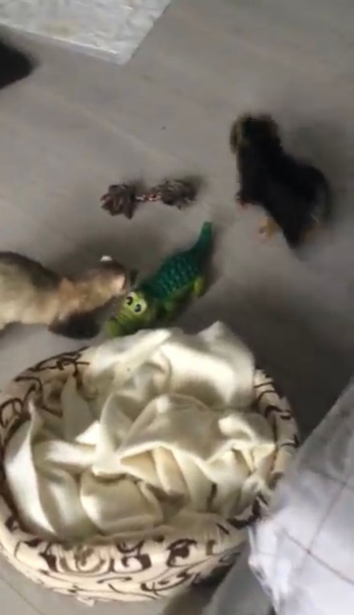 3. オモチャの取り合いでケンカする子犬とフェレット。微笑ましくも激しいバトルの結末は!?
