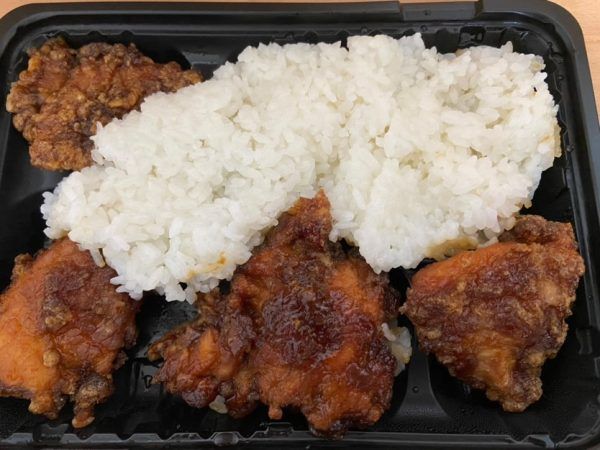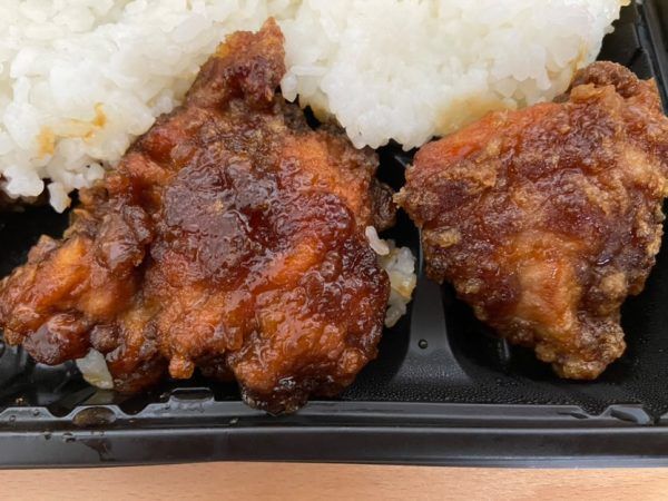甘辛いタレたっぷりついた唐揚げは、ジューシーでごはんが進みました。唐揚げ弁当はごはんと唐揚げのみしか入っていないので、おかずを食べたい方はご注意を。ハンバーグ弁当とお魚弁当は色々とおかずも入っているそうです。
