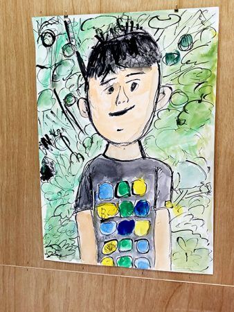 5年生の“さむがりしろくま“君は、将来絵本作家になりたいと思っています。この自信に満ちた表情!この絵は自画像で、竹ペンで描くとかっこいいと思って描いたそう。ほんとうに!竹ペンの効果がめちゃくちゃ上手く表現されていますよね。学校の後アトリエに通い、2時間くらいかけて制作するのも「楽しいです」とサラリ。ほんとうに好きなんですね。