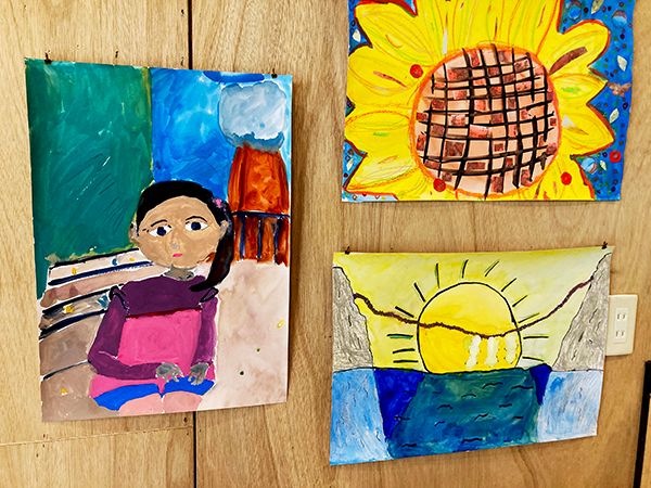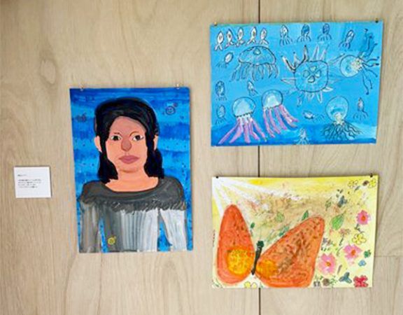 4年生のpiyoちゃんも、ちいさなアーティスト。この日は会場を案内しています。どんなひまわりを描きたかったの?と聞くと、「あったかいひまわり。蝶々が踊ってる感じ」ほんとうにそれが伝わる!自画像も斜めな感じがいいですね〜