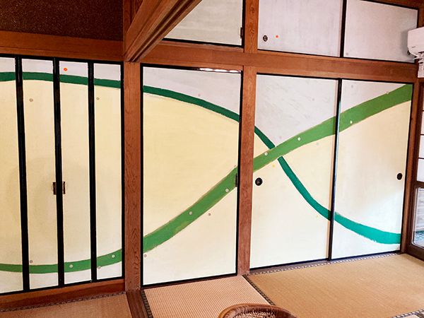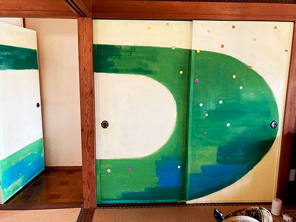 奥の部屋には、オーギさん制作の襖絵「緑のトーラス・春」