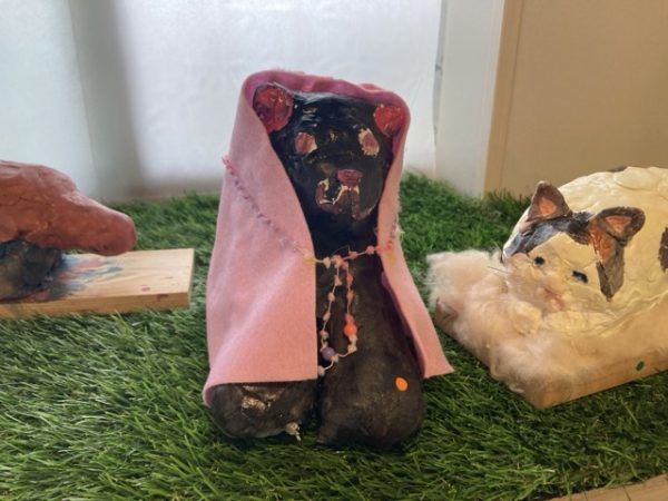 様々な素材を使います。これはアルミを芯にして紙粘土で作った猫ちゃんたち。