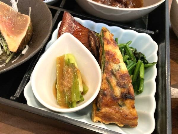 小鉢は宮城県産うるい酢味噌、しばさき農園さんの菜花雪菜と挽肉キッシュ、仙台産ほうれん草のナムル、寒さば照焼。