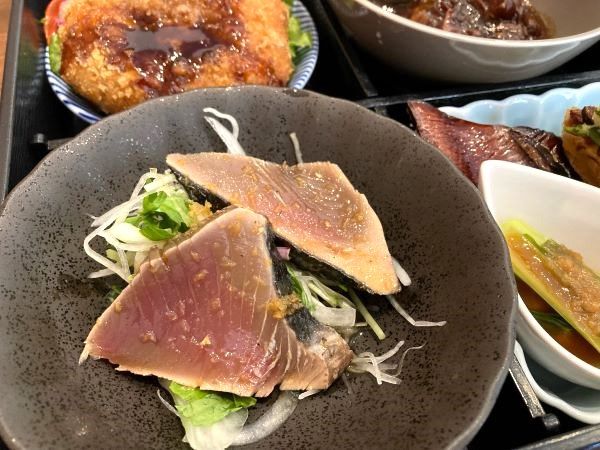 お刺身は千葉産かつおを店内で藁焼きしたもので、下には香味野菜がたっぷり。