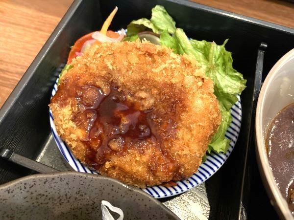 和風豆腐と野菜のメンチカツは揚げ立てでサクっとジューシー、さいの目切りのゴボウがいい食感。下にはカラフル野菜のサラダも。