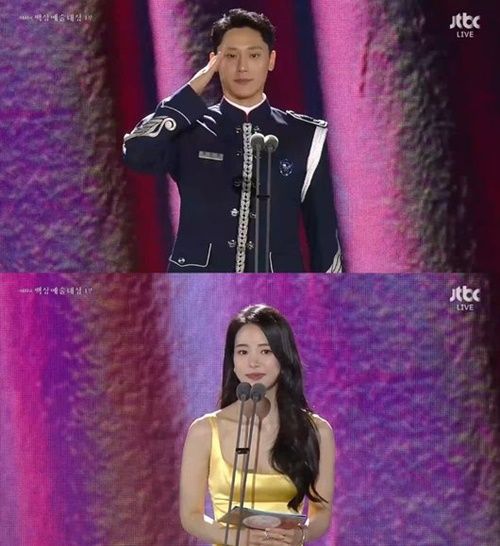 この日、『破墓』で映画部門の男性新人演技賞を受賞したイ・ドヒョンは軍服を着てステージに上がり、「ジヨン、ありがとう」と力強い告白をし、視聴者を熱狂させた。