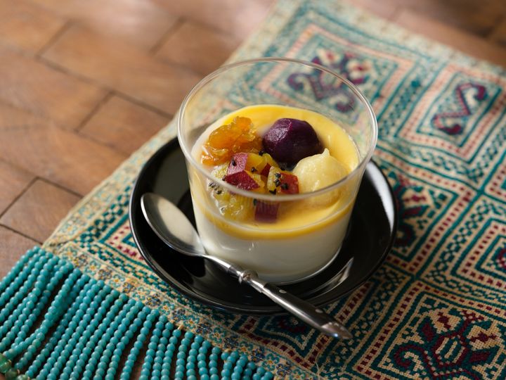 ーー「モーモーチャーチャー」は、マレーシアなどの東南アジアの家庭で食されているデザート。ふっくら炊き上げた自家製さつま芋煮と煮豆、羽二重餅と芋餅がブラマンジェによく合います。よく混ぜて食べると美味しいそうですよ!