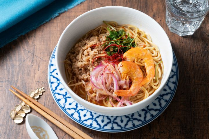 ーーいよいよ5位! こちらは多くの人の支持を集める麺料理です。ココナッツクリームにナンプラーやチリインオイル、ライム果汁を加えて作ったコクのあるスープに、揚げ海老をトッピング。ココナッツクリームのおかげでピリ辛の加減が抑えられていると好評です。