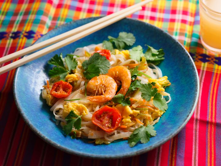 ーーシンガポール風の焼ビーフンが楽しめる商品です。玉ねぎやしいたけなどの野菜が入っており、さらにくるみなどもトッピング。さまざまな味を楽しめます。甘めの味付けをベースに、レッドカレーペーストなどで辛味を加えてあるので、程よい刺激がクセになりそうです。