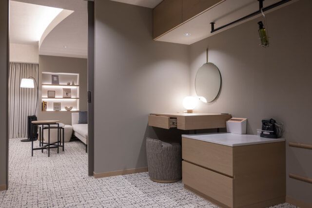 「ロイヤルコーナーツイン~TSUGARU~」は、玄関で靴を脱ぐシューズオフスタイルで、自宅のようにくつろげます。玄関エリアも広く、荷物を置くスペースやハンガー、座って利用できる化粧台も置かれます。