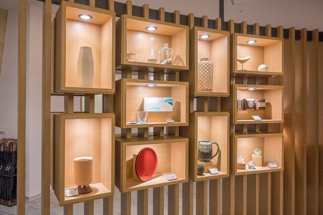 青森の工芸品を飾るラックは、1970年代まで使われた “リンゴの木箱” がモチーフです。漆を塗り重ねて独特の模様を描く津軽塗や、ねぶたの山車に乗る巨大な人形を形作る破損に強い「ねぶた和紙」、色彩豊かな「津軽びいどろ」など、小さなスペースながら見応え十分。簡単な説明も添えられます。こうした出会いのきっかけも、ホテルならではの体験です。