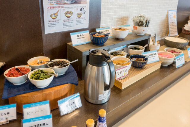 トッピングが充実したお茶漬けコーナーも注目です。カリカリ梅やわさび菜お浸し、なめたけなどが用意され、好みの味で作れます。お店で身をほぐした鮭フレークは、塩味を抑えた優しい味わいです。おすすめは、青森県南部地方のご飯のお供「コムラのなんばんみそ」。細かく切った大根やニンジンを唐辛子とともに醪(もろみ)に漬けたピリ辛の味。青森の味を試してみてください。