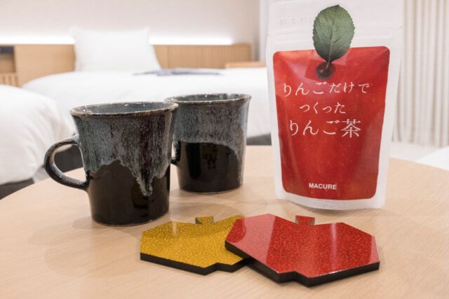 津軽焼きのマグカップやびいどろグラスのほか、リンゴの形をした津軽塗コースターが置かれ、リンゴ茶のティーバッグも用意。冷蔵庫の中にはウェルカムドリンクのリンゴジュースが冷えています。季節によってリンゴの品種も異なります。この日はジョナゴールドでした。