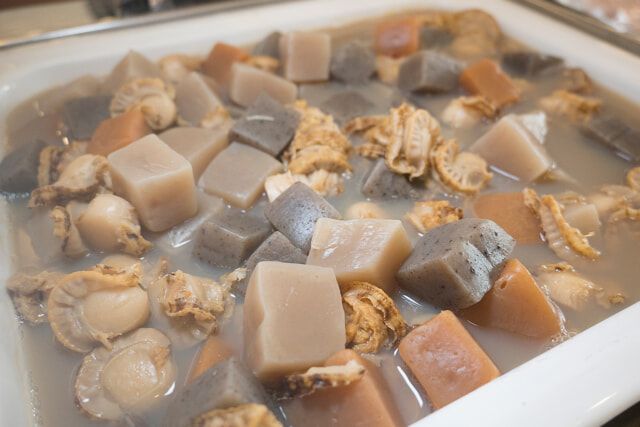 青森と言えばホタテが有名ですが、「ホタテとこんにゃくの煮もの」には県産のベビーホタテをたくさん使って旨味たっぷり。ぶつ切りのこんにゃくや野菜とともに煮込まれて、毎日提供されます。