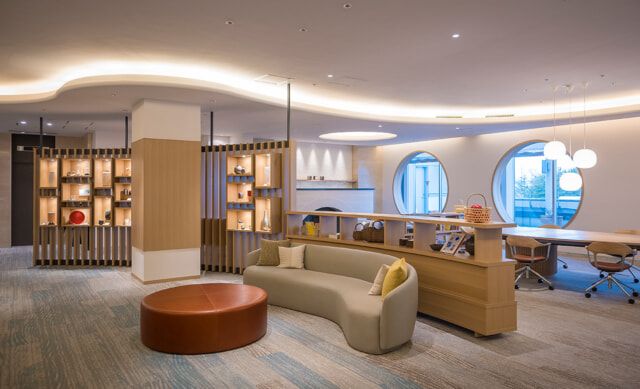 優雅な曲線が間接照明で映えるフロントロビー。工芸品が飾られたラックやソファも曲面を多用します。広々とした空間に柔らかなラインがくわわり、くつろいだ雰囲気を生み出していました。