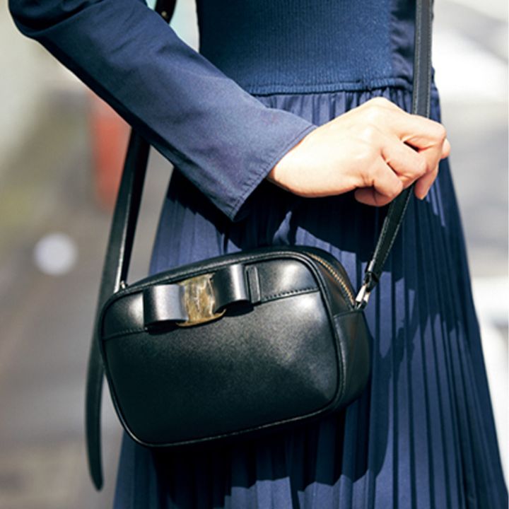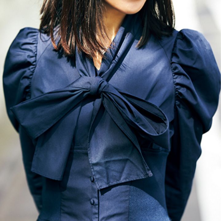 一枚で華やかなネイビーコーデが完成するお気に入り。リボンは取り外しができるので、その日の予定や気分で使い分けています。