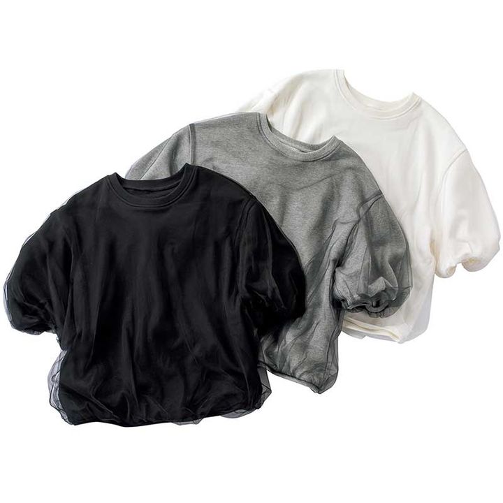 夏も涼しく着られる薄手のスウェットT。チュール使いは今年のトレンドで、カジュアルとキレイめをいいとこ取りしたデザイン。コンパクト丈ながらも短すぎず、屈んだりしても安心です。