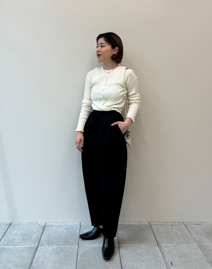ディテールを生かしたミニマルなパンツスタイル。「あえて目立つアクセサリーは着けず、とことんシンプルなコーディネートしたのがポイント。アンヌークのニットカーディガンは、カシュクールデザインとサムホールディテールがお気に入りです」