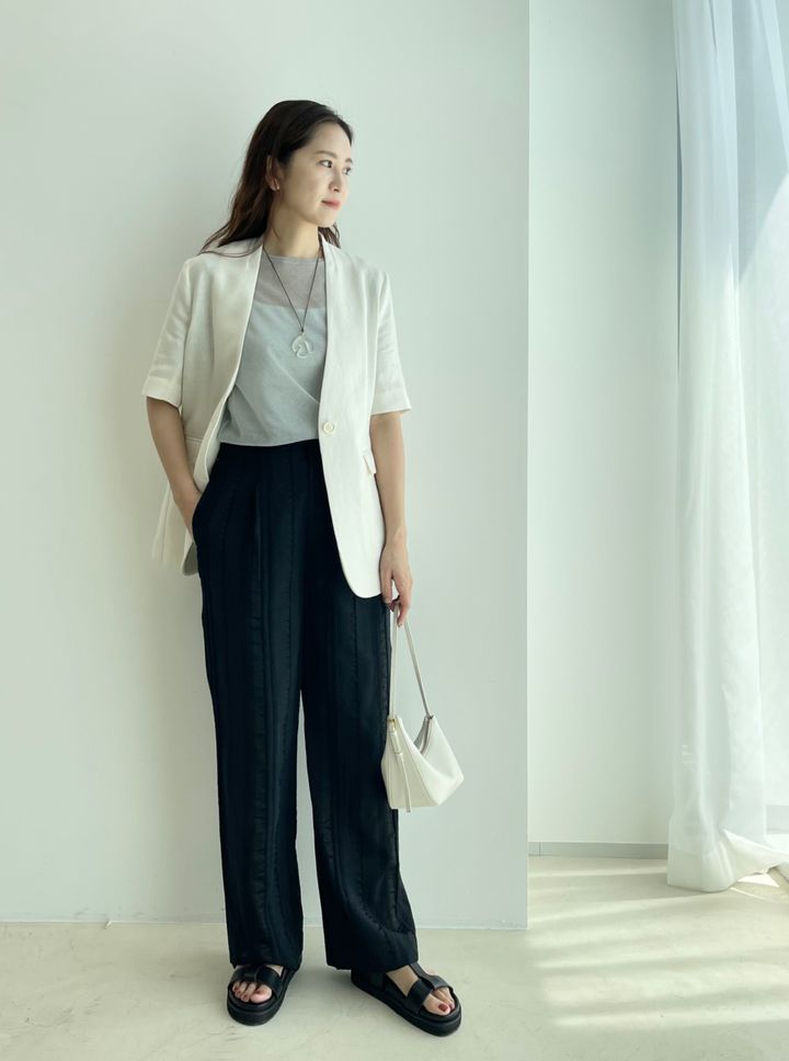 シンプルなモノトーンコーデは異なる素材使いがポイント。「ワッシャー加工されたジャカード素材のパンツやラメ入りのシアーニットなど、質感の異なる素材を組み合わせて、シックなモノトーンカラーでも抑揚のあるコーディネートになるよう意識しました」
