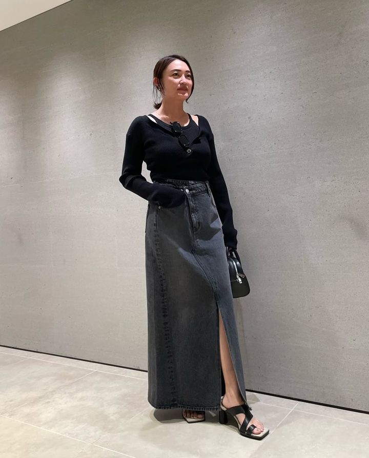 女性らしいディテールを散りばめた大人のリラックスカジュアル。「一見シンプルに見えるニットとデニムの組み合わせですが、カーディガンがウルトラクロップト丈になっていたり、タンクは旬のアメスリデザインと女性らしいカッティングでトレンドも意識しています」