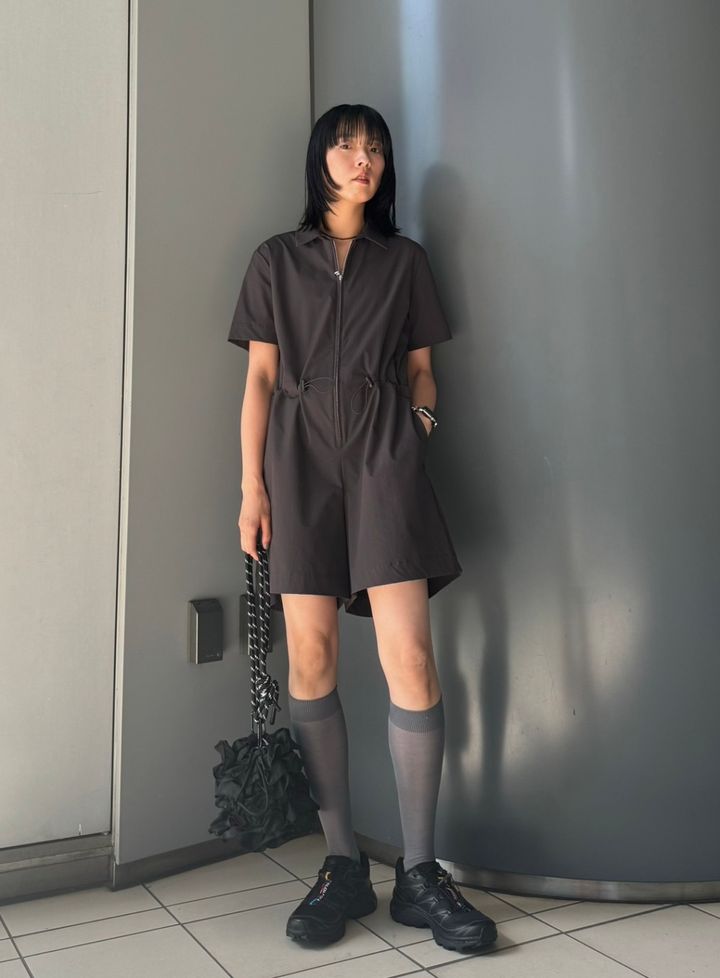 ショート丈+ソックスでモノトーンルックの鮮度をアップ。「オールインワンはカジュアルな印象なので、ジップを少しあけてデコルテを見せたり、ウエストは緩めに絞って大人のヌケ感を意識。シアー素材のハイソックス×ハイテクスニーカーでトレンドも取り入れました」