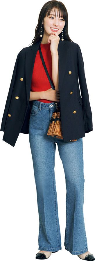 ブルーデニムに鮮やか色のニットを合わせ、カゴバックで愛嬌を添えたフェミカジュスタイル。金ボタンがリッチなジャケットを肩に引っ掛ければ、プレッピー味も加わって一層今ドキに♪