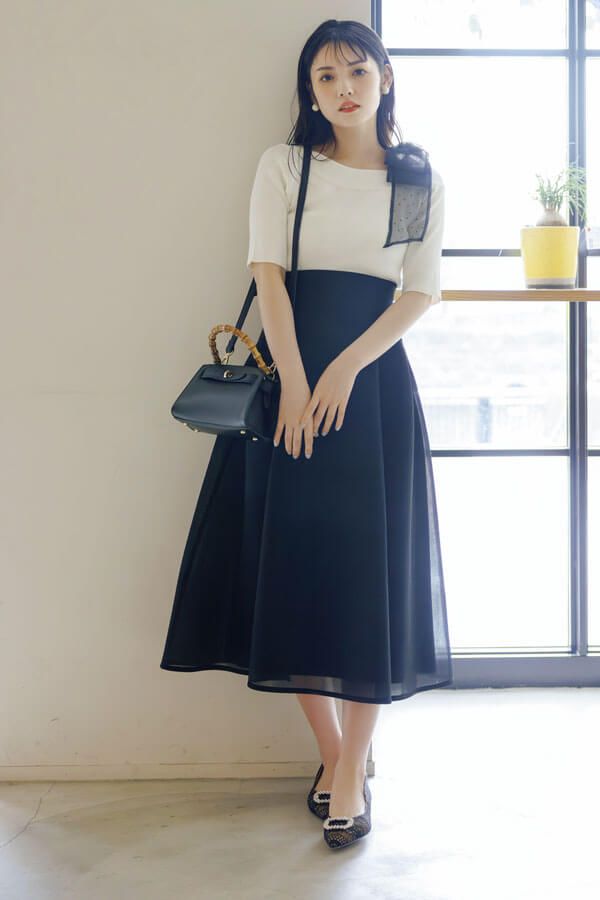 ビジューレースフラットシューズ (H2cm)¥25,960/ランバン コレクション(モーダ・クレア) 肩リボ ンニット¥8,690/31 Sons de mode(ヒロタ) フレアスカート¥ 24,200/アプワイザー・リッシェ バンブーバッグ¥6,490/カシュカシュ(アンビリオン) パールイヤリング¥5,940/アビステ