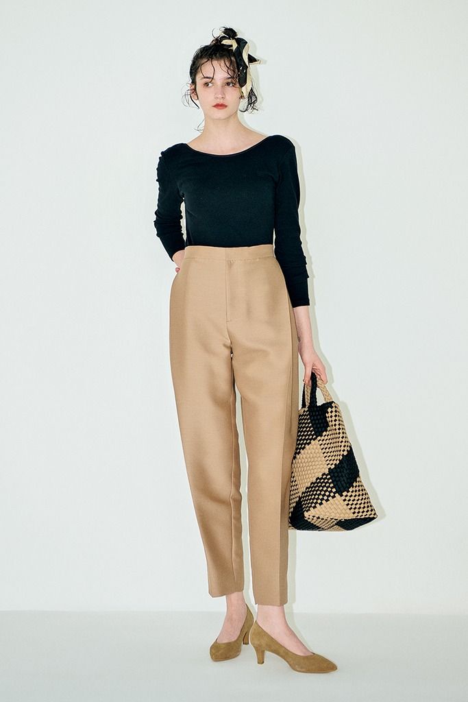センターシームや縦に落ちる素材感による直線が、脚長につながる見た目をあと押し。「脚につかず離れずの」絶妙シルエット。