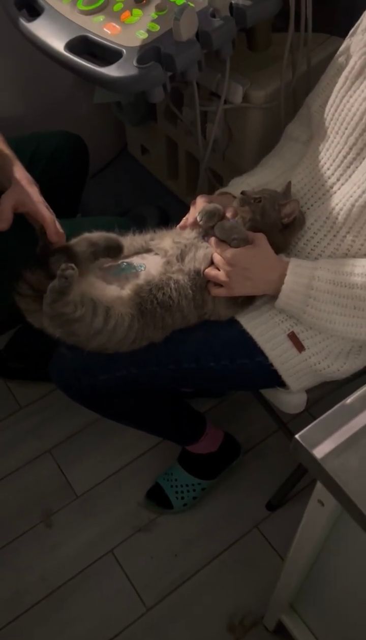 すると、向かい合って座っていたドクターが猫お腹の毛を掻き分け始めました。 ネコはキョトンとした表情を浮かべていますが、事態が呑み込めなくて「なにが始まるの!?」となってしまっているようです。