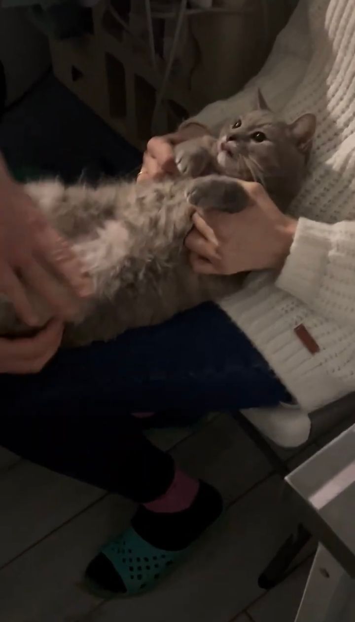 そこには、飼い主さんの膝の上で仰向けで寝ているネコの姿が。